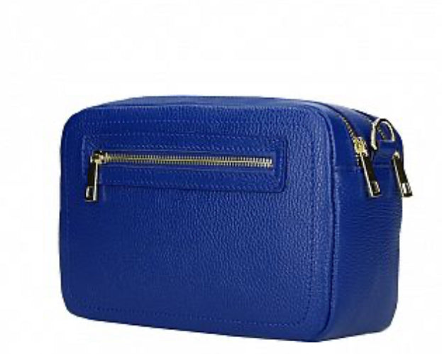 Genuine Italian leather cross body bag with detachable cross body strap, gold colour fixings, two separate compartments, outside zip pocket.
