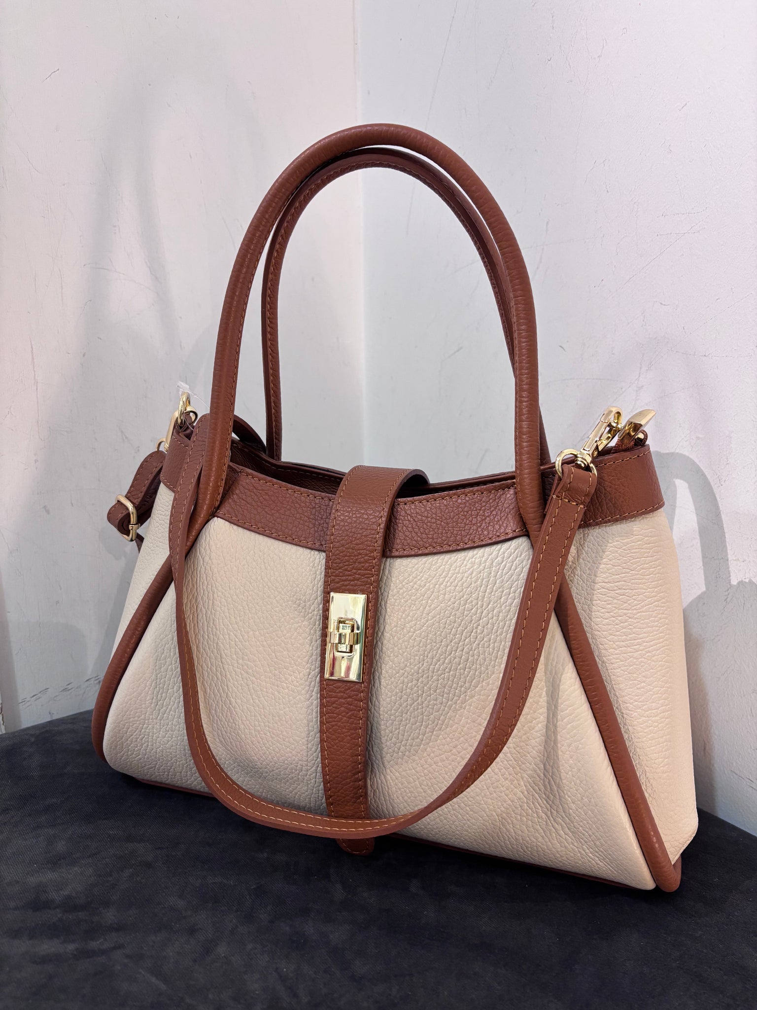 New for Spring 2026! Genuine Italian leather bag with zip closure at the top, gold accessories, inside pocket and adjustable shoulder strap.