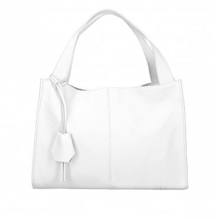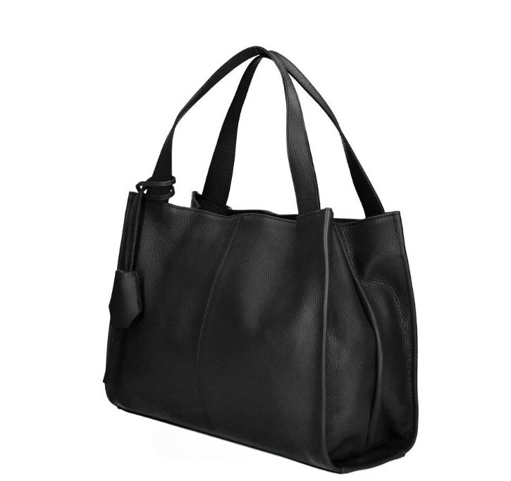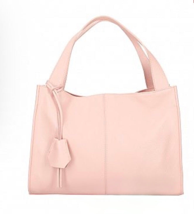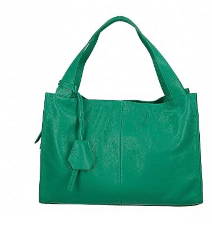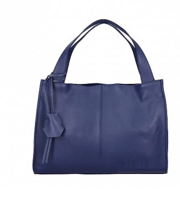 Large Italian soft leather handbag with nickel metal accessories, side pocket, mobile phone holder, inside zip pocket, polyester lining.